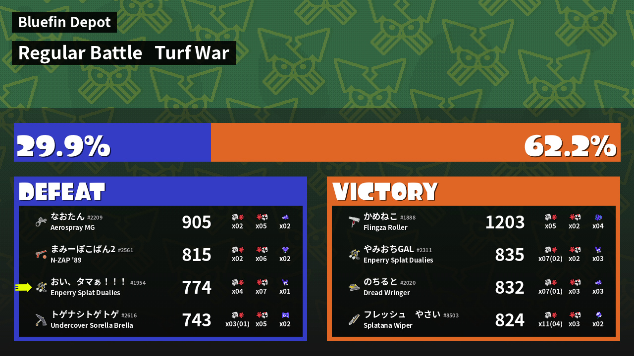 | Weapon | Enperry Splat Dualies ( Curling Bomb / Triple Splashdown) | ||