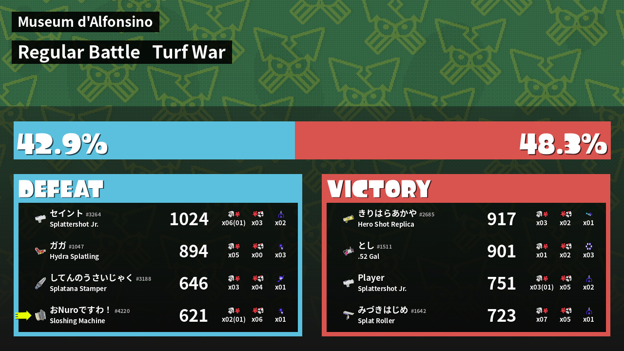 | Medals | #1 Enemy-Base Inker #1 Splat Assister #1 Ground Traveler | ||