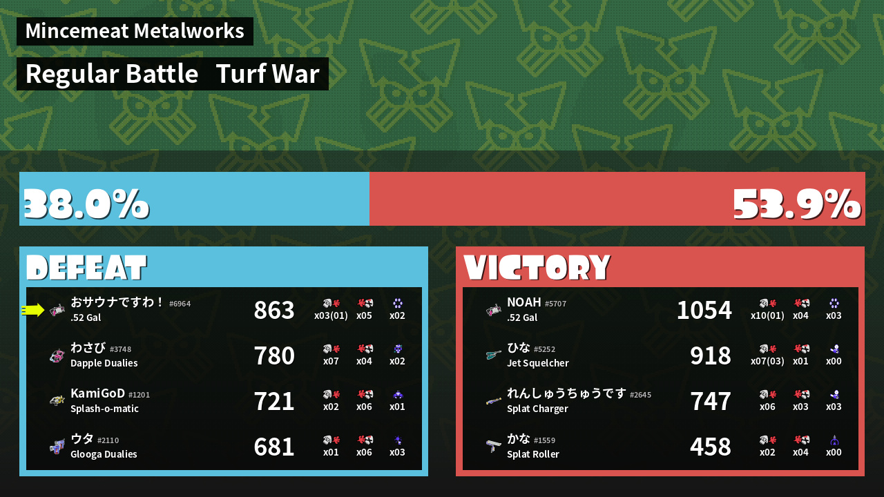 | Medals | #1 Turf Inker #1 Splat Assister #1 Damage Taker | ||