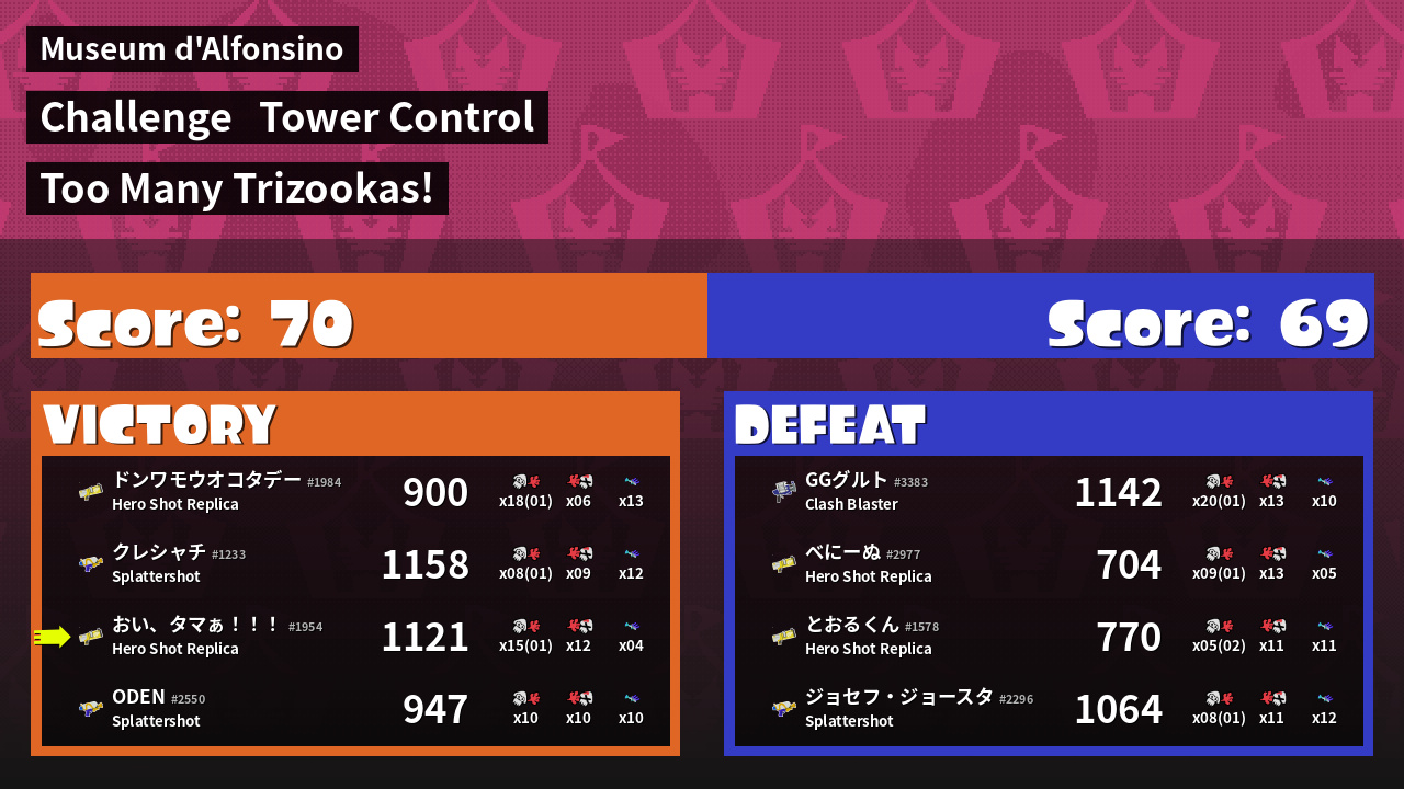 | Medals | #1 Splat Assister #1 Ink Consumer #2 Overall Splatter | ||