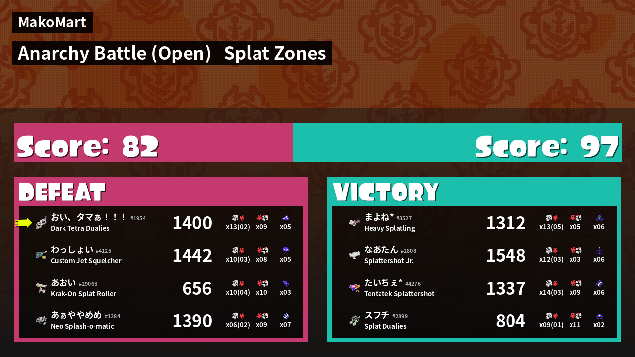 | Mode | Splat Zones - Anarchy Battle (Open) | ||