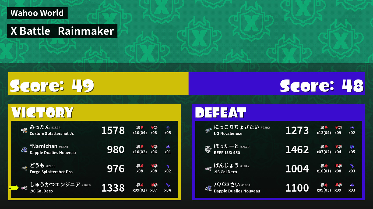 | Medals | #1 Enemy Splatter #1 Rainmaker Stopper #1 Kraken Royale User | ||