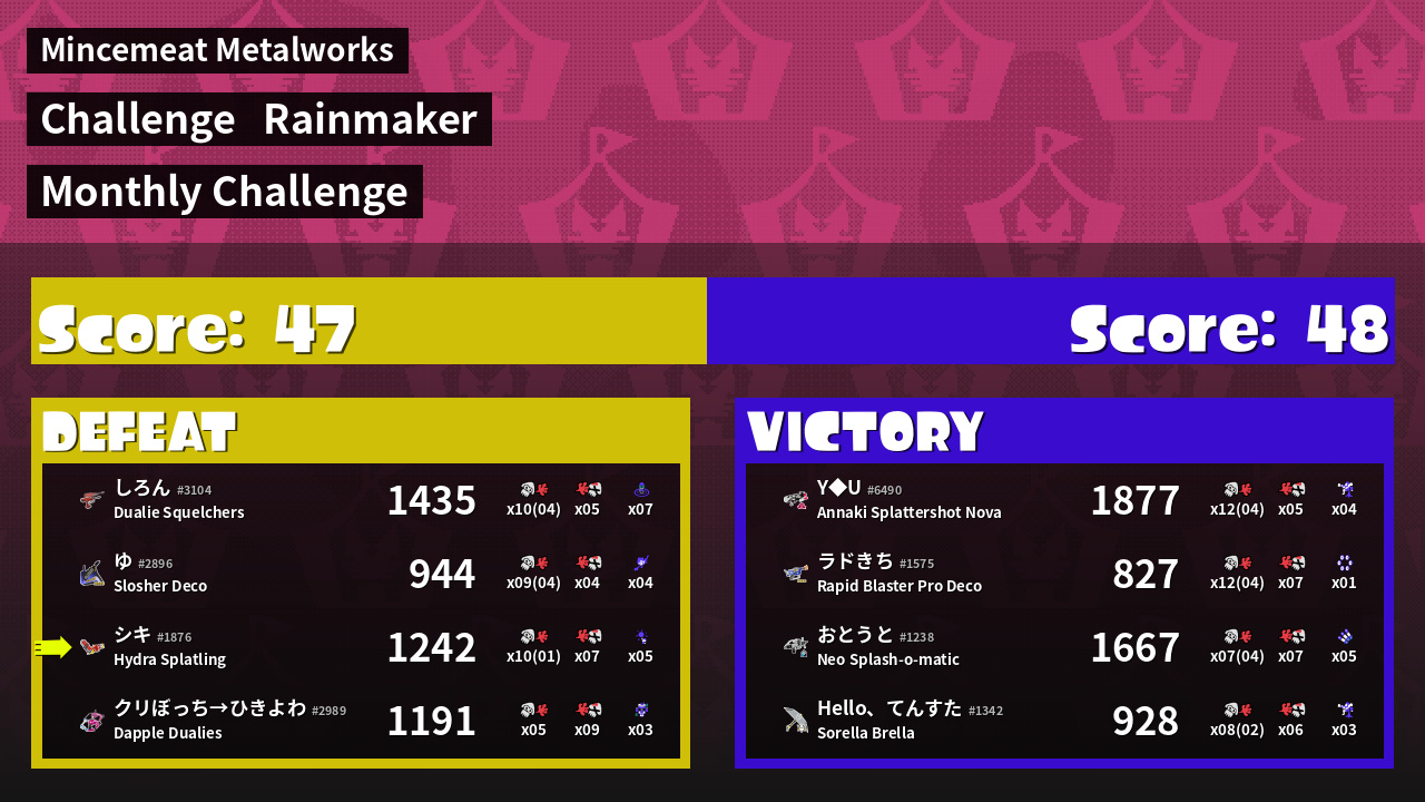 | Medals | #1 Overall Splatter #1 Enemy Splatter #1 Booyah Bomb User | ||