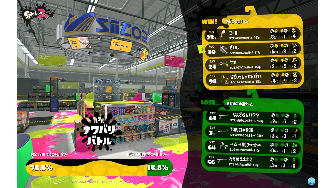 | Splatfest Title | きのこの山 Fangirl 2 → きのこの山 Fiend 1 | |||||||||||||||||||||||||||||||