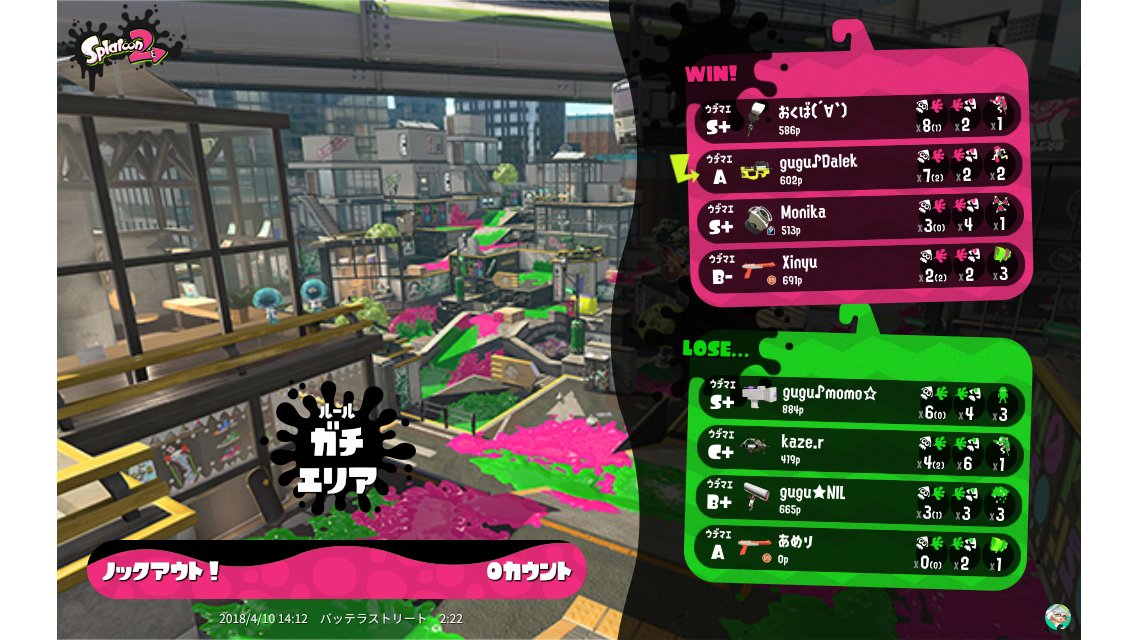 | Name | Weapon | Level | Rank | Inked | k+a/sp | k/d |