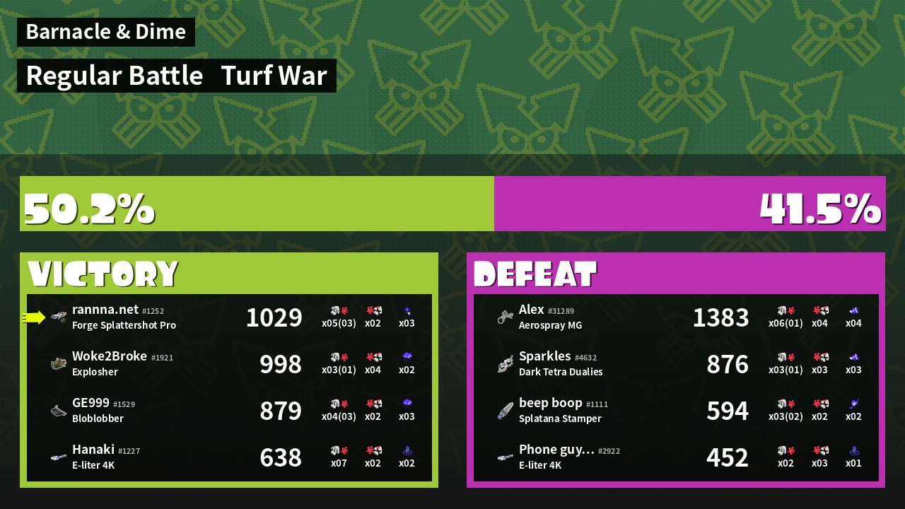 | Medals | #1 Turf Inker #1 Splat Assister #1 Ground Traveler | ||