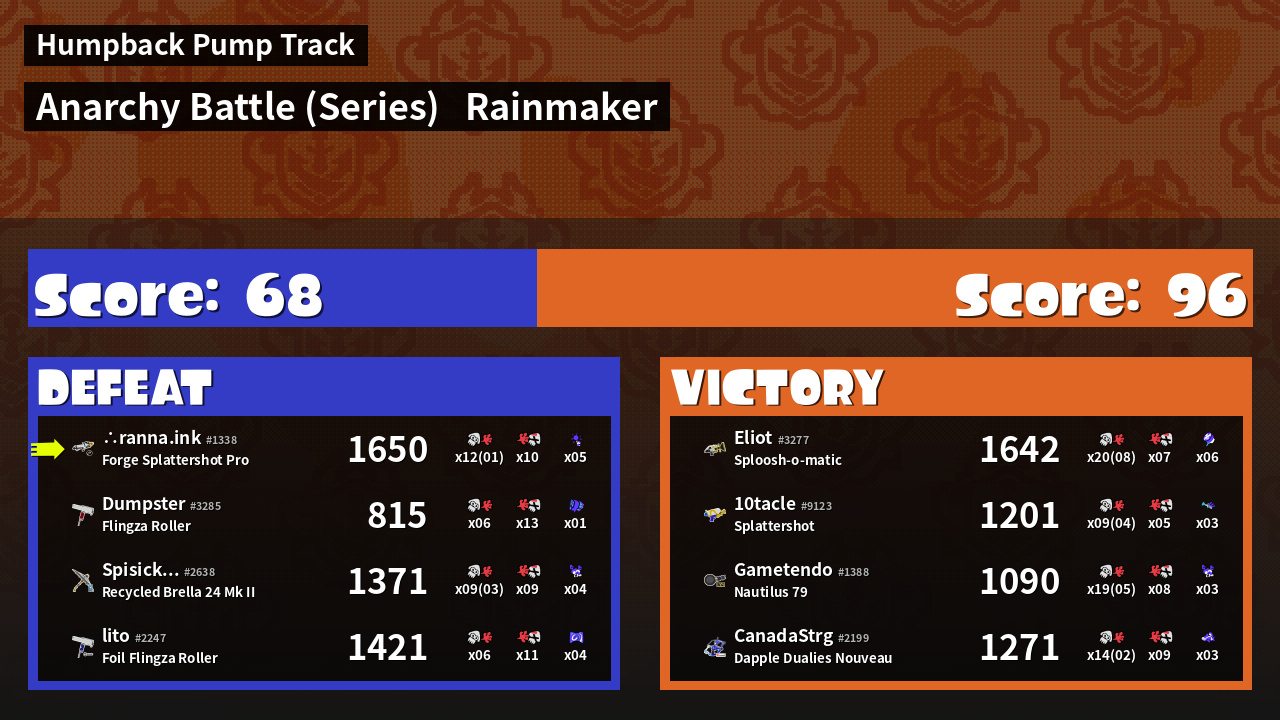 | Medals | #1 Overall Splatter #1 Turf Inker #1 Enemy Splatter | ||