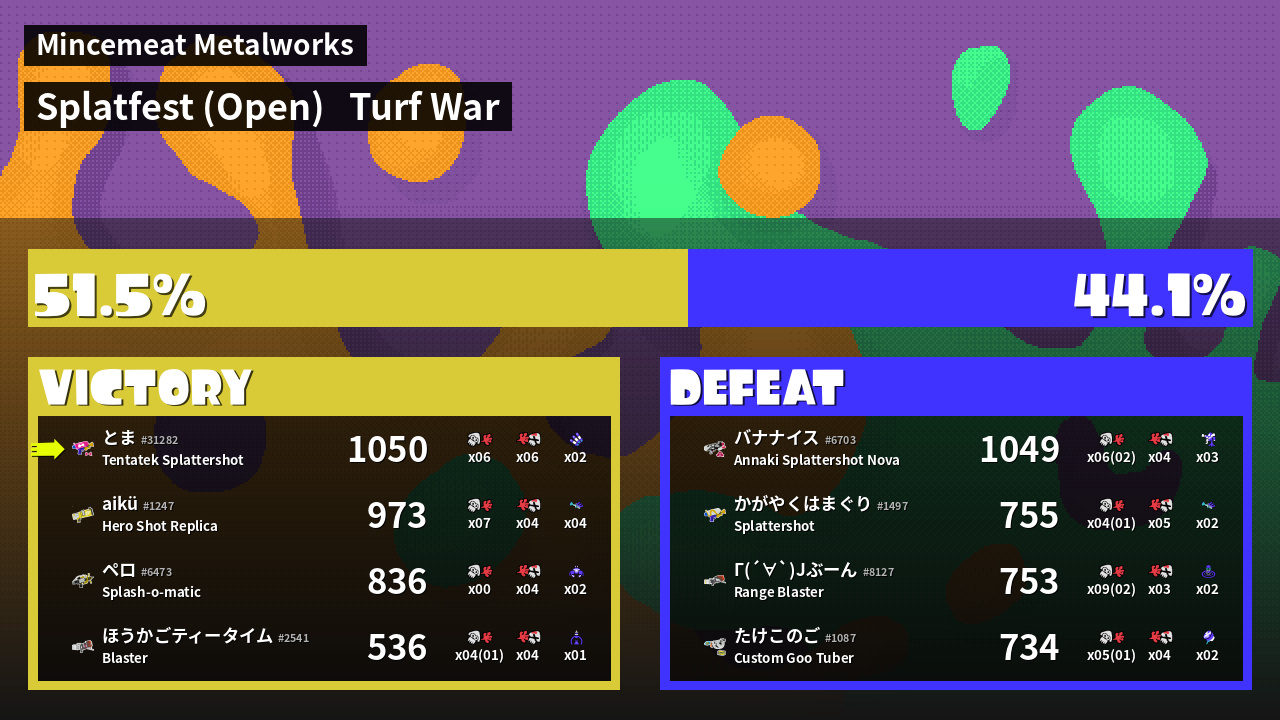 | Splatlandian Youth  とま #31282 |  Tentatek Splattershot                    | 1,050 | 6 + 0 | 6 | 1.00 |  2 | |