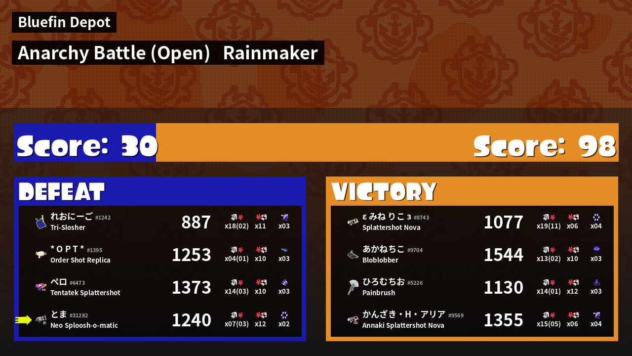 | Medals | #1 Super Jump Spot #1 Splat Assister #1 Rainmaker Carrier | ||