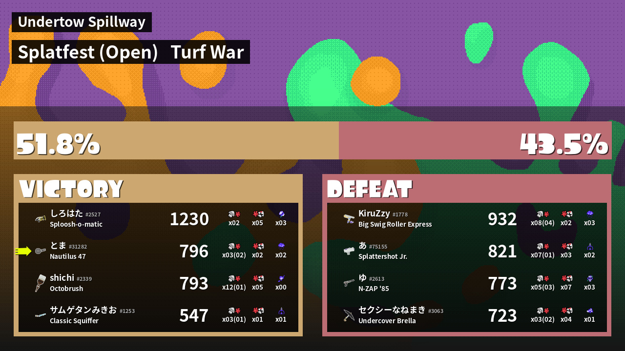 | Medals | #1 Splat Assister #2 Overall Splatter #2 Turf Inker | ||
