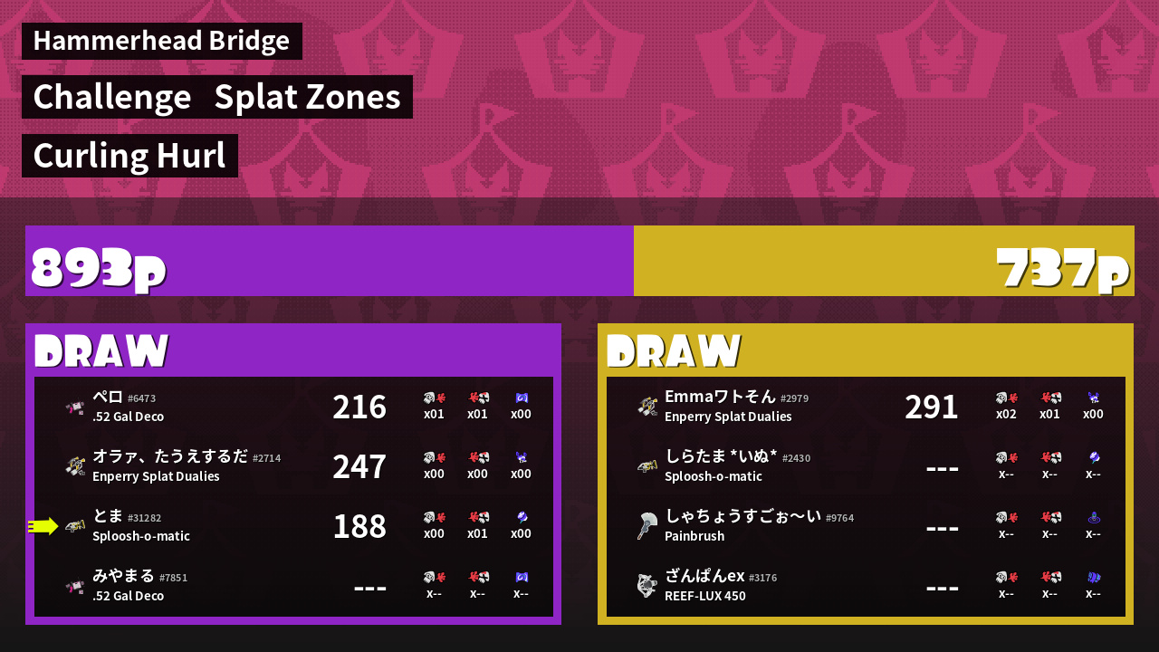 | Weapon | Sploosh-o-matic ( Curling Bomb / Ultra Stamp) | ||