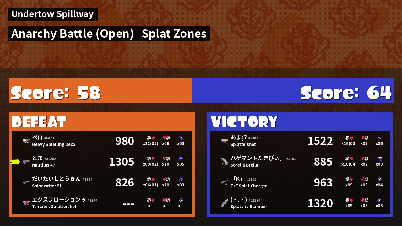 | Mode | Splat Zones - Anarchy Battle (Open) | ||