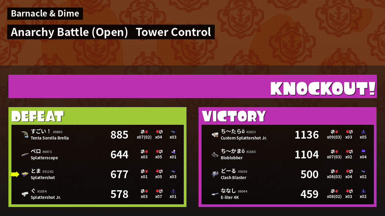 | Dandy Snacks  ち~たらö #2833 |  Custom Splattershot Jr.                    | 1,136 | 6 + 3 | 3 | 2.00 |  5 | |