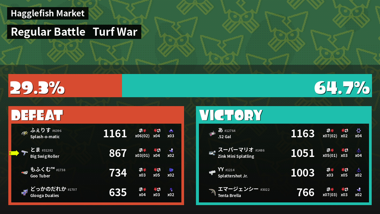| Bursting Jumper YY #1214 |  Splattershot Jr.                    | 1,003 | 3 + 0 | 5 | 0.60 |  2 | |