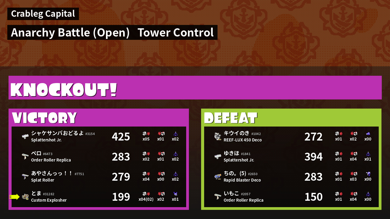 | Name | Weapon | Inked |  k |  d | KR | Sp | |