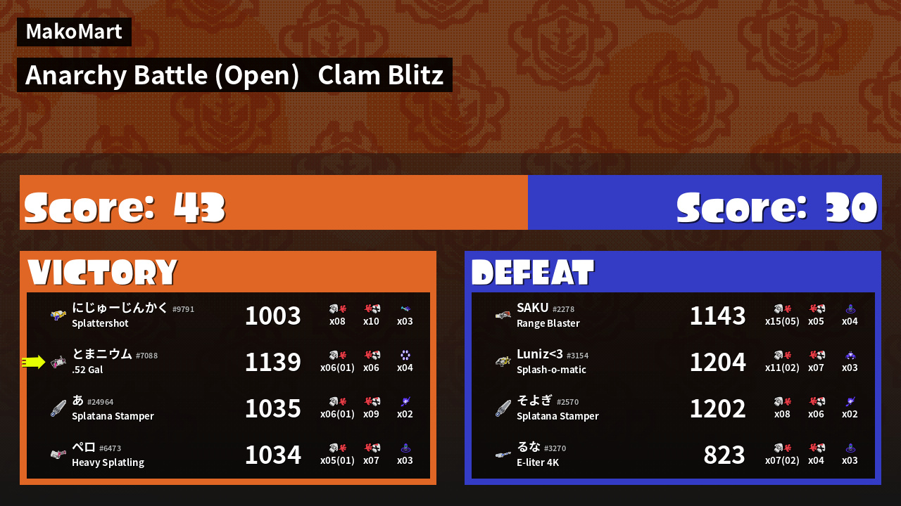 | Mode | Clam Blitz - Anarchy Battle (Open) | ||