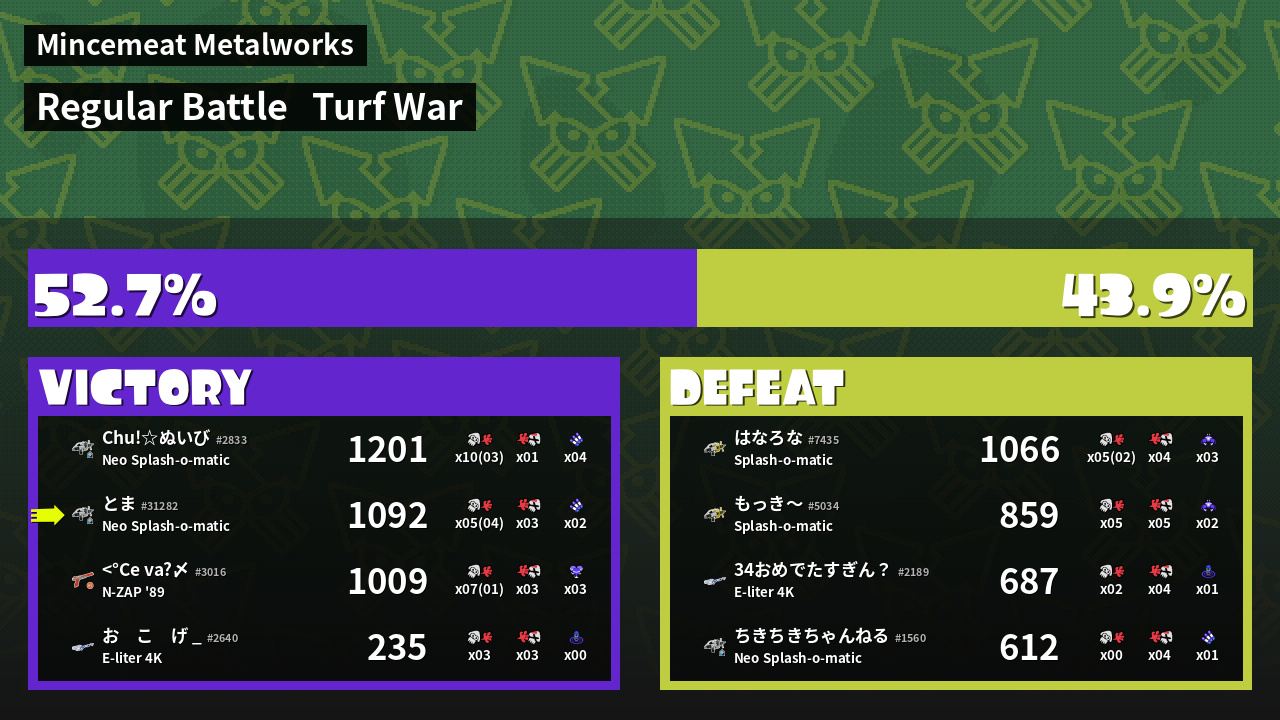 | Medals | #1 Home-Base Inker #1 Splat Assister #1 Damage Taker | ||