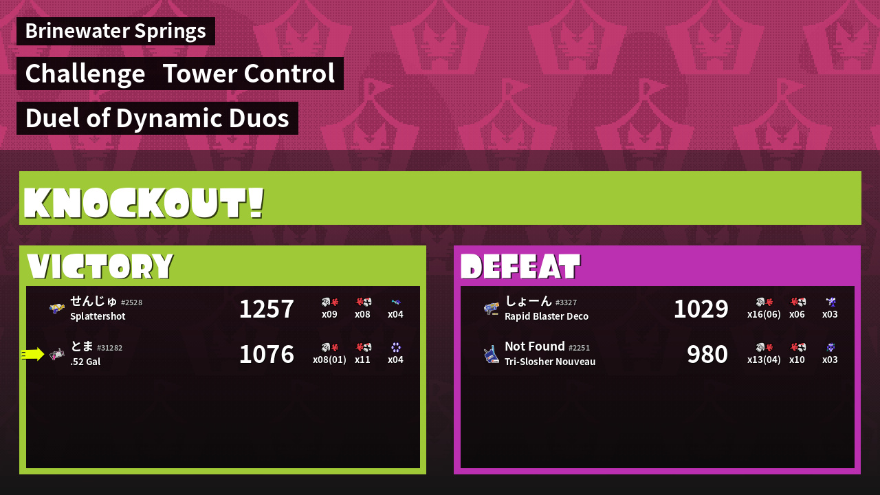 | Pitch-Black Freshwater Fish せんじゅ #2528 |  Splattershot                    | 1,257 | 9 + 0 | 8 | 1.12 |  4 | |