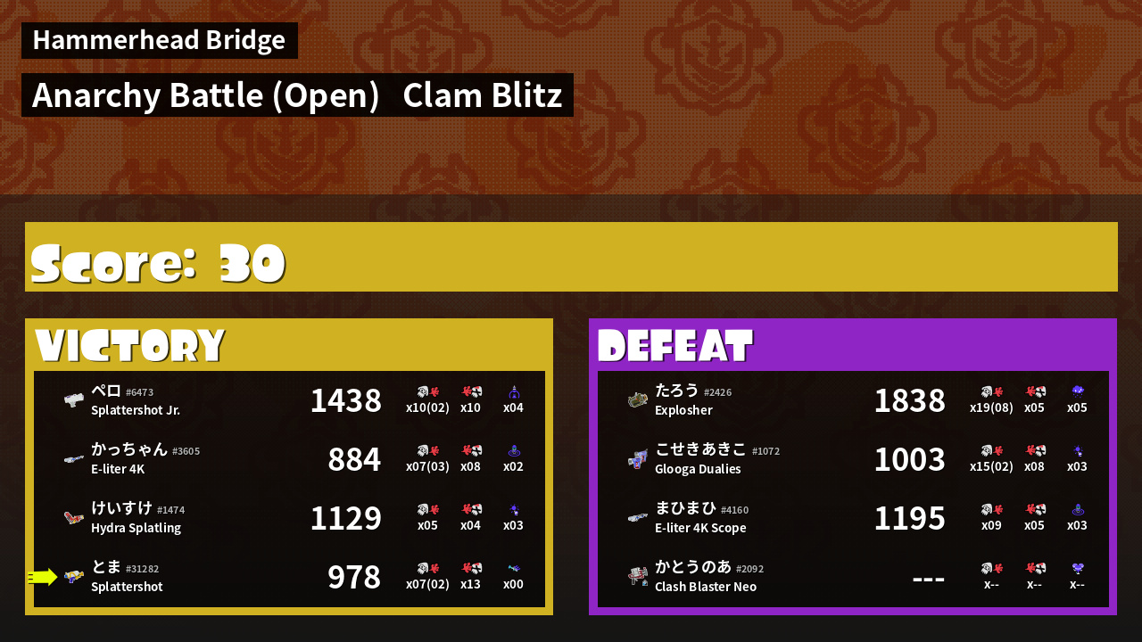 | Mode | Clam Blitz - Anarchy Battle (Open) | ||