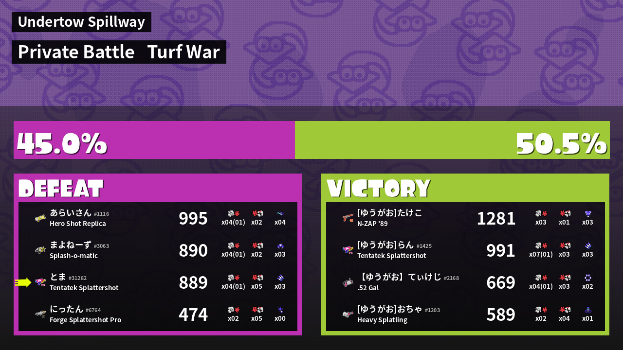 | Medals | #1 Overall Splatter #1 Enemy-Base Inker #1 Enemy Splatter | ||