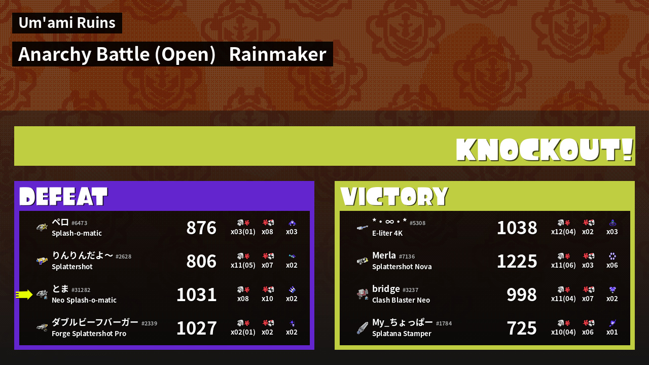 | Medals | #1 Turf Inker #1 Enemy Splatter #1 Rainmaker Stopper | ||