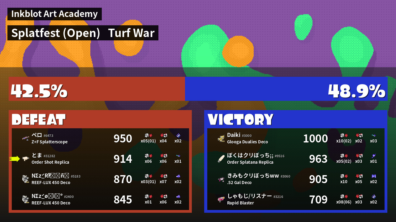 | Medals | #1 Overall Splatter #1 Home-Base Inker #1 Enemy Splatter | ||