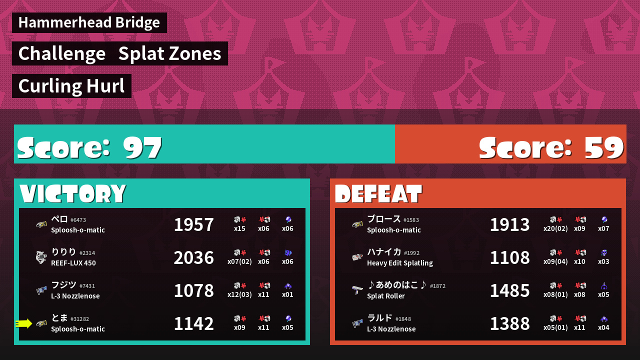 | Medals | #1 Popular Target #1 Splat Zone Hero #1 Damage Taker | ||