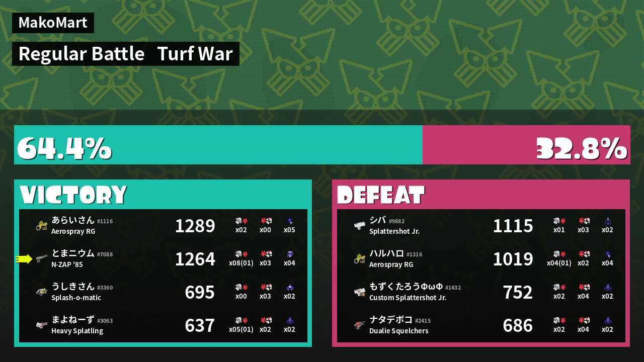 | Medals | #1 Overall Splatter #1 Enemy-Base Inker #1 Enemy Splatter | ||