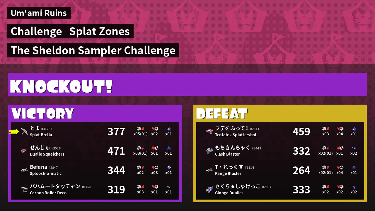 | Weapon | Splat Brella ( Sprinkler / Triple Inkstrike) | ||