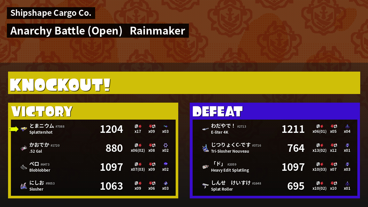 | Medals | #1 Overall Splatter #1 Turf Inker #1 Enemy Splatter | ||