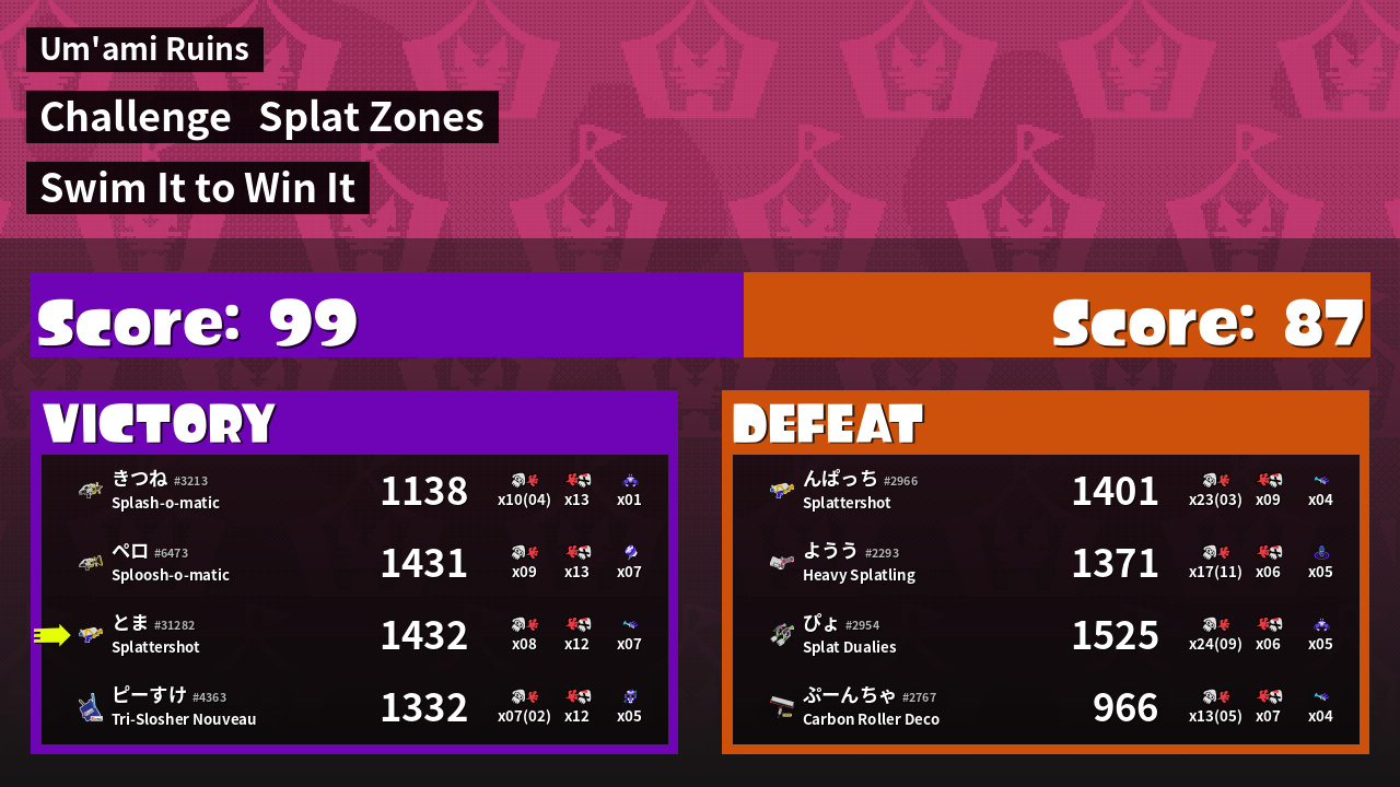 | Medals | #1 Splat Zone Inker #1 Turf Inker #1 Damage Taker | ||