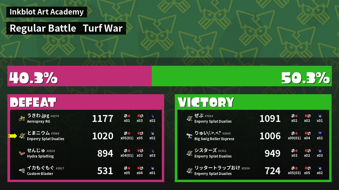 | Medals | #1 Overall Splatter #1 Enemy-Base Inker #1 Splat Assister | ||
