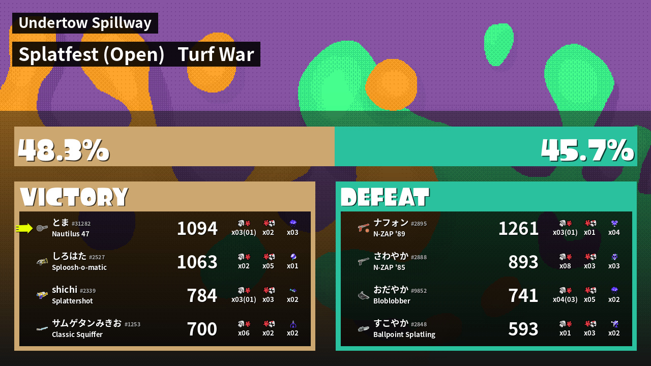 | Medals | #1 Turf Inker #1 Splat Assister #1 Ink Storm User | ||
