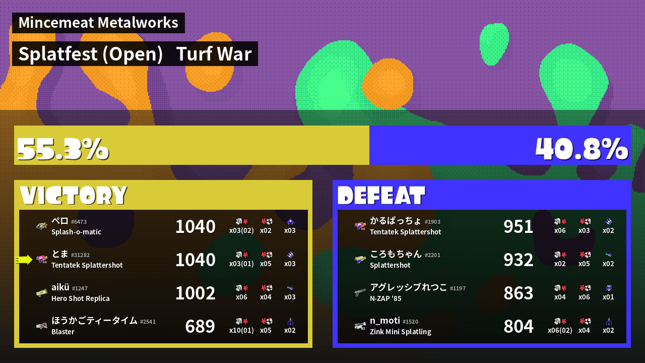 | Splatlandian Youth  とま #31282 |  Tentatek Splattershot                    | 1,040 | 2 + 1 | 5 | 0.40 |  3 | |