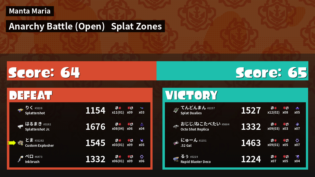 | Mode | Splat Zones - Anarchy Battle (Open) | ||