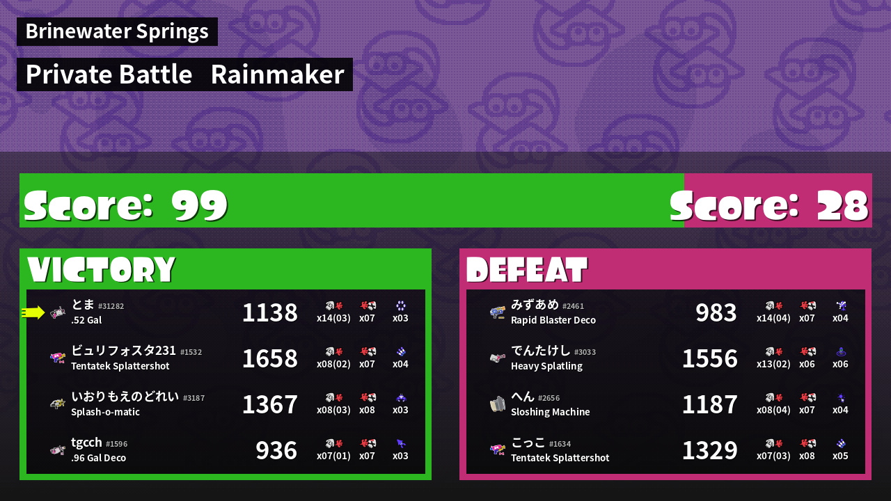 | Medals | #1 Overall Splatter #1 Popular Target #1 Enemy Splatter | ||