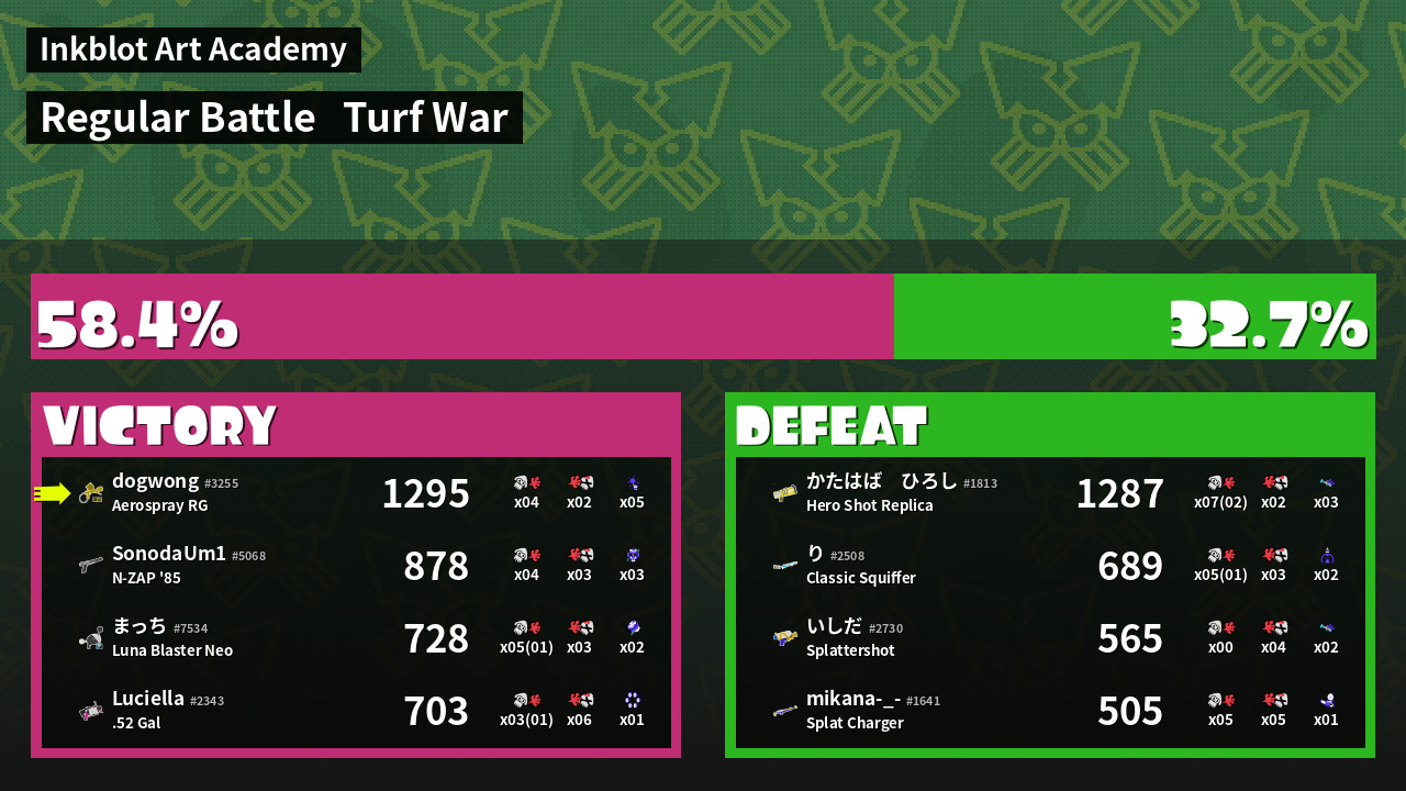 | Medals | #1 Turf Inker #1 Super Jump Spot #1 Enemy Splatter | ||