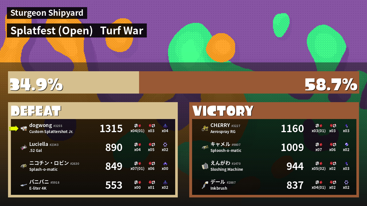 | Medals | #1 Turf Inker #1 Enemy-Base Inker #1 Splat Assister | ||