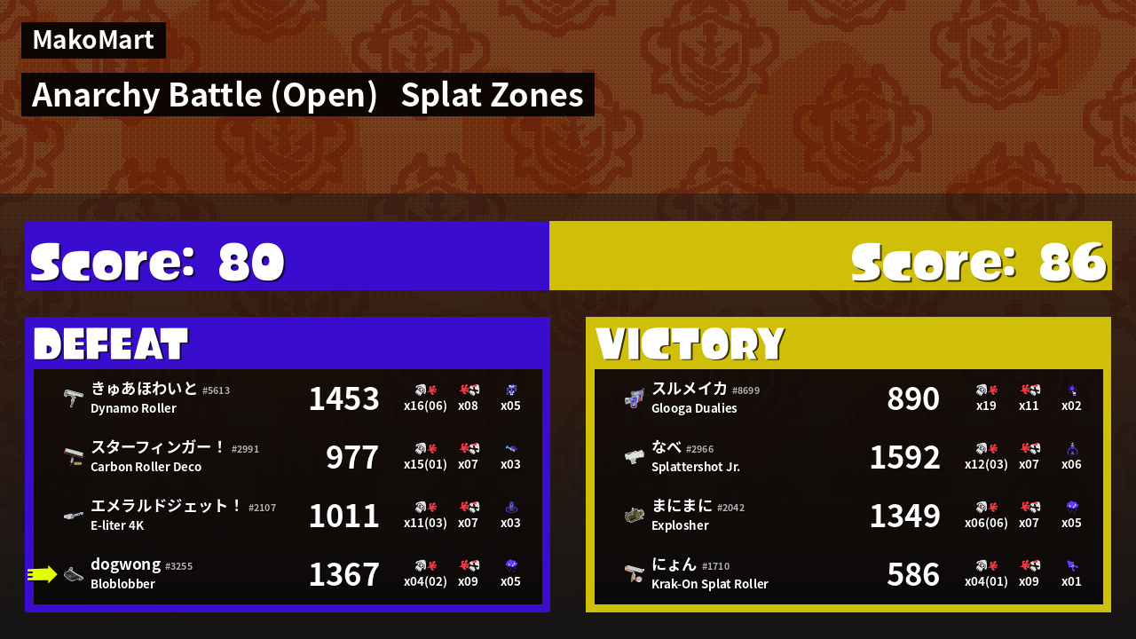 | Mode | Splat Zones - Anarchy Battle (Open) | ||