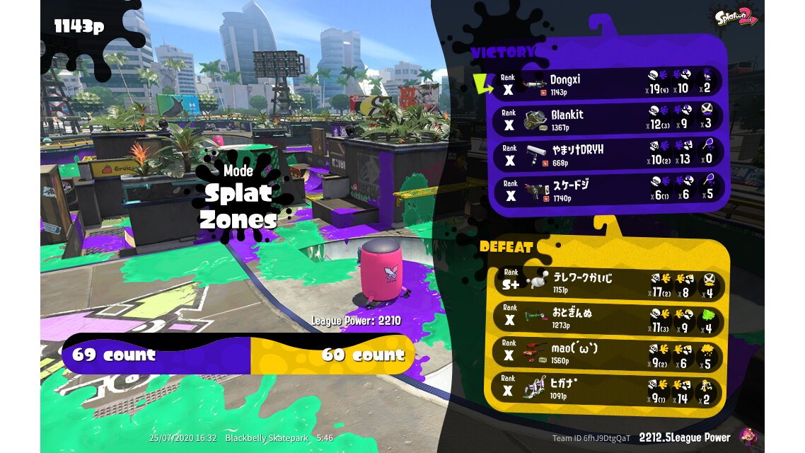 | Mode | Splat Zones - League Battle (Quad) | ||||||||||||||||