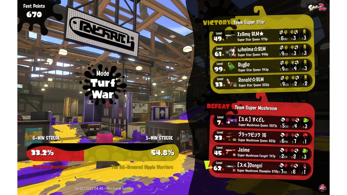 | Mode | Turf War - Splatfest (Team) | ||||||||||||||||||||||