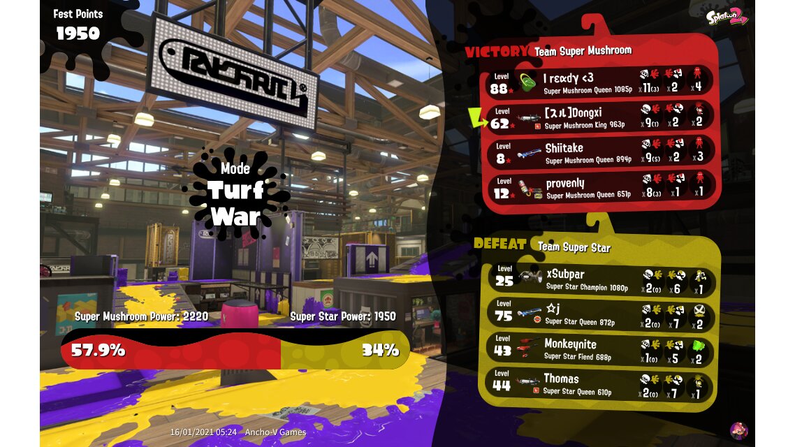 | Mode | Turf War - Splatfest (Pro) | ||||||||||||||||