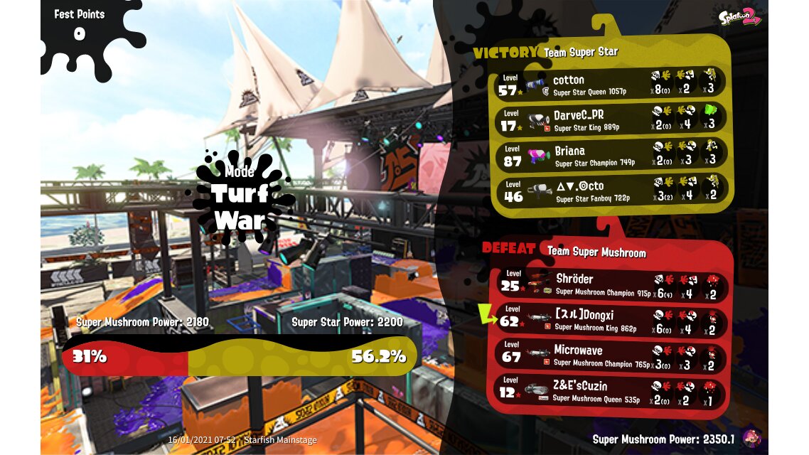 | Mode | Turf War - Splatfest (Pro) | ||||||||||||||||