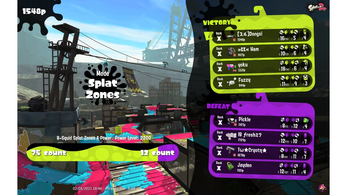 | Mode | Splat Zones - Ranked Battle | ||||||||||||||||
