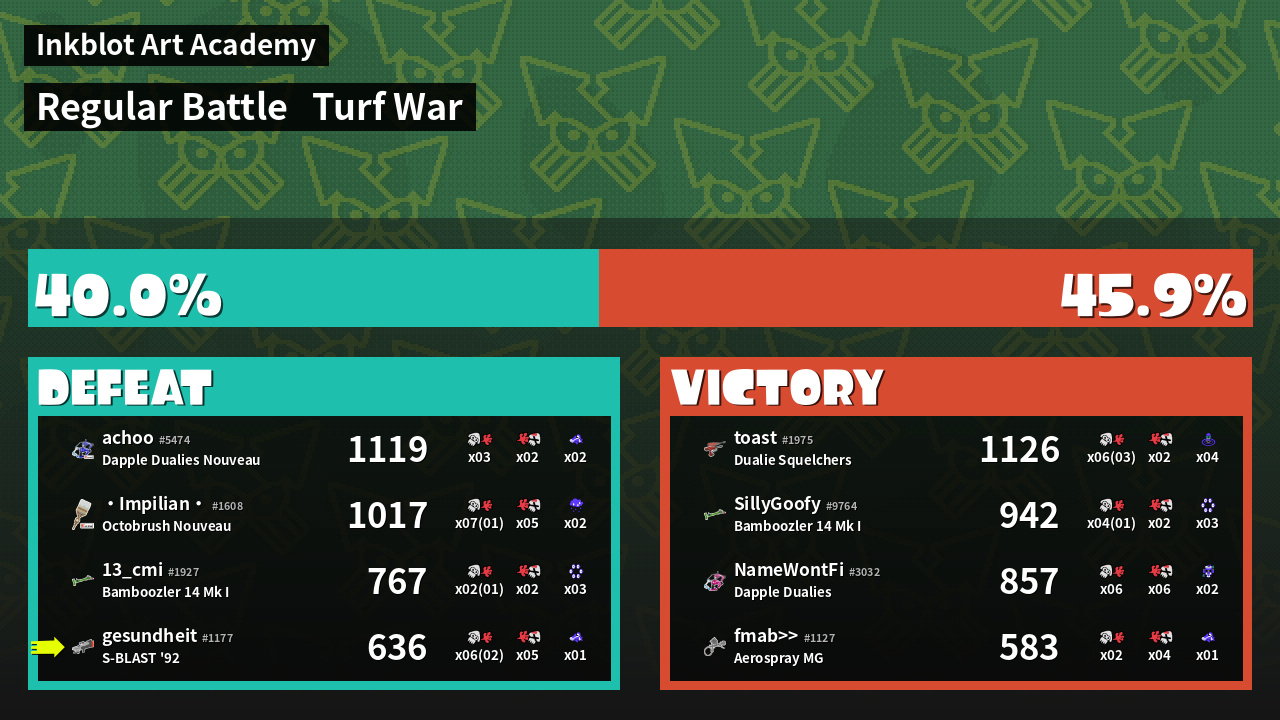 | Medals | #1 Popular Target #1 Splat Assister #1 Damage Taker | ||
