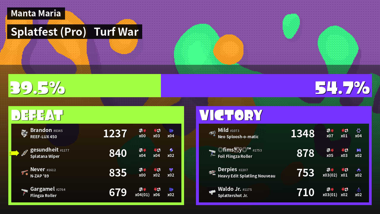 | Medals | #1 Overall Splatter #1 Popular Target #1 Enemy-Base Inker | ||
