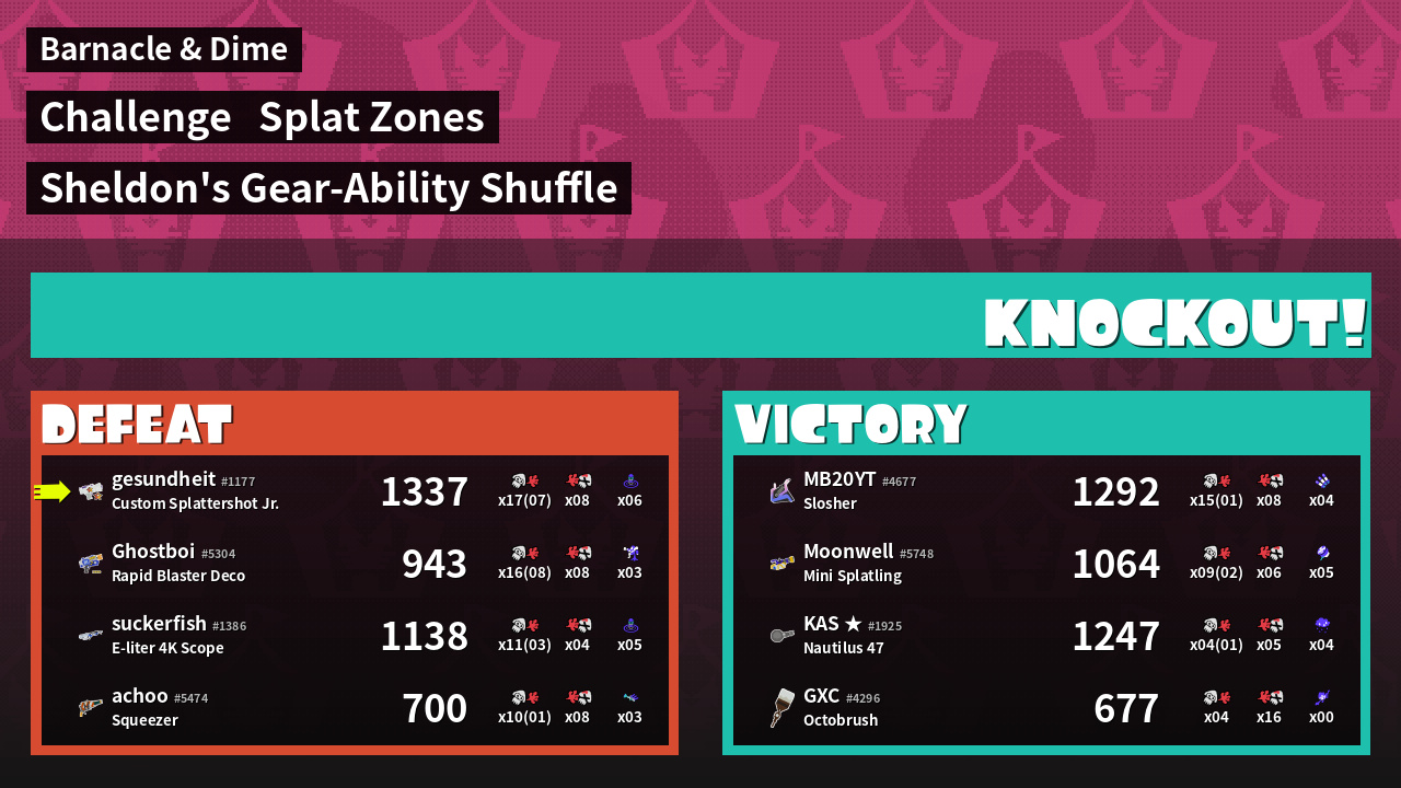 | Medals | #1 Overall Splatter #1 Splat Zone Inker #1 Splat Zone Guard | ||