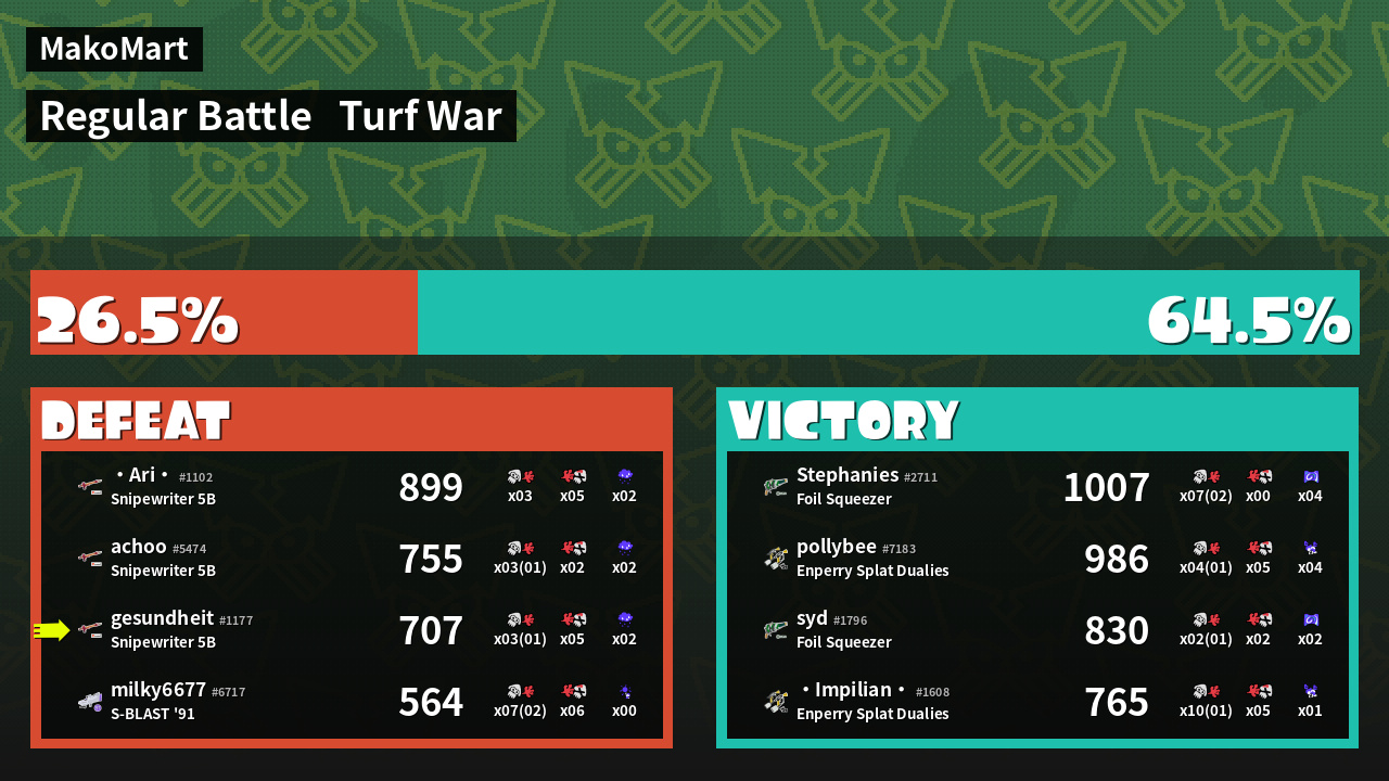 | Medals | #2 Overall Splatter #2 Popular Target #2 Enemy-Base Inker | ||