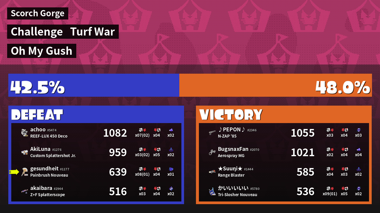 | Medals | #1 Overall Splatter #1 Popular Target #1 Enemy-Base Inker | ||