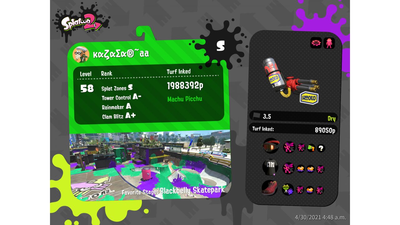 | Name | Weapon | Level | Rank | Inked | k+a/sp | k/d |